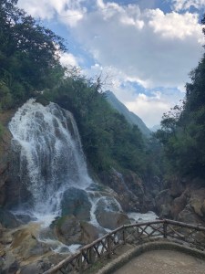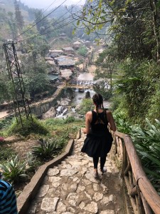 Before randomly running into Chi that day we were actually about to do our own little trek to the Cat Cat Village which was about a 30-minute walk outside of Sa Pa. When we got to Cat Cat Village we learned that there was an entrance fee and paid it. It’s always an awkward feeling in SEA to have to pay for something that we had hoped would be an authentic experience, but we really wanted to see the village and didn’t mind supporting the locals in this way. Cat Cat Village is set among hilly terrain further into the valley below Sa Pa. People make their way down stone steps that zig-zag through homes and shops set up by the H’mong inhabitants. Along the way there are quirky monuments and viewpoints that allow you to see the vast landscape and rice terraces. Farmers tend to their land while children and animals run freely. The windy stone staircase eventually led us to the valley floor where the locals built a really cool plaza along a river. A waterfall can be seen on one end of the plaza downriver while shops and exhibits were spread about upriver.