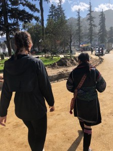 Sa Pa is home to eight distinct ethnic minority tribes: the H’mong, Dao, Tay, Giay, Muong, Thai, Hoa, and Xa Pho. The H’mong make up over 50% of the tribal minority and were definitely the most commonly seen. All of the different tribes had distinct garment colors and styles, but we liked the H’mong’s the best with their colorful yet predominately black attire. Walking throughout the town you can see clusters of similarly dressed tribal folk wandering the area like little street gangs. Different tribes had pop-up shops where they sold vibrant, hand-made clothes and souvenirs. Tribal villagers would frequently walk up to us asking if we were interested in shopping; they were very demanding about it too sometimes. If you successfully refused shopping they would then ask if you were interested in doing a trek to their village outside of the city. This is actually a normal activity some tourists do, but Madison and I waited until a couple of days later to actually take one of the tribal people up on this offer. While sitting at a park on our first day in Sa Pa, a H’mong tribeswoman approached us and started some small talk. Since we had already been approached a couple times by demanding tribeswomen we were a little reluctant to start a conversation with this one, but she ended up being kind and non-pushy. A couple of days later we would randomly run into her again on the streets and learn that her name is Chi. She was such a pleasant lady the first time we met her that we were genuinely excited to run into her again. After chatting with her again we decided to take her up on her offer to lead us on a trek to her village the next morning. Chi gave us free bracelets and made us pinky-promise that we would honor the arranged meet up time.