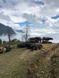 Our last full day in Sa Pa was the day we had arranged with Chi to trek to her village. We met her out front of Sa Pa Station as planned and began our journey at the city center. Chi led us by foot to the outskirts of the city, through the back of a local neighborhood, and onto a rocky path that marked the end of urban terrain. From here she led us increasingly higher into the surrounding mountains. Madison and I felt right at home hiking through bushes and trees at high elevation due to our upbringing in the Pacific Northwest back in the states. That familiar feeling diminished a bit as we encountered cows and water buffalo grazing freely on the mountainside. We soon crossed paths with other tribespeople leading their own sets of tourists to their respective villages.