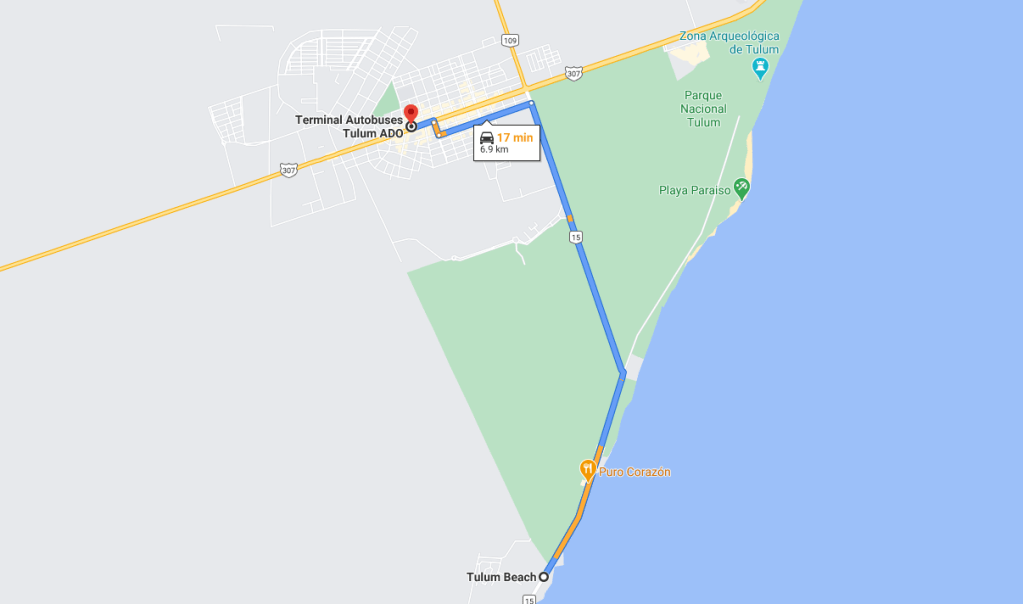 We took yet another Ado bus southbound on a quick one hour ride to Tulum. Immediately on arrival, we hailed a taxi which took us to our Airbnb, located about a 10-minute drive outside of the downtown area.